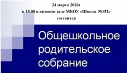 24.03.2026 в 18.000 в актовом зале МБОУ ;Школа 152" состоится "Общешкольное родительское собрание"