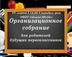 23.03.2026 в 18.00 в актовом зале МБОУ "Школа №152" состоится "Родительское собрание будущих первоклассников"